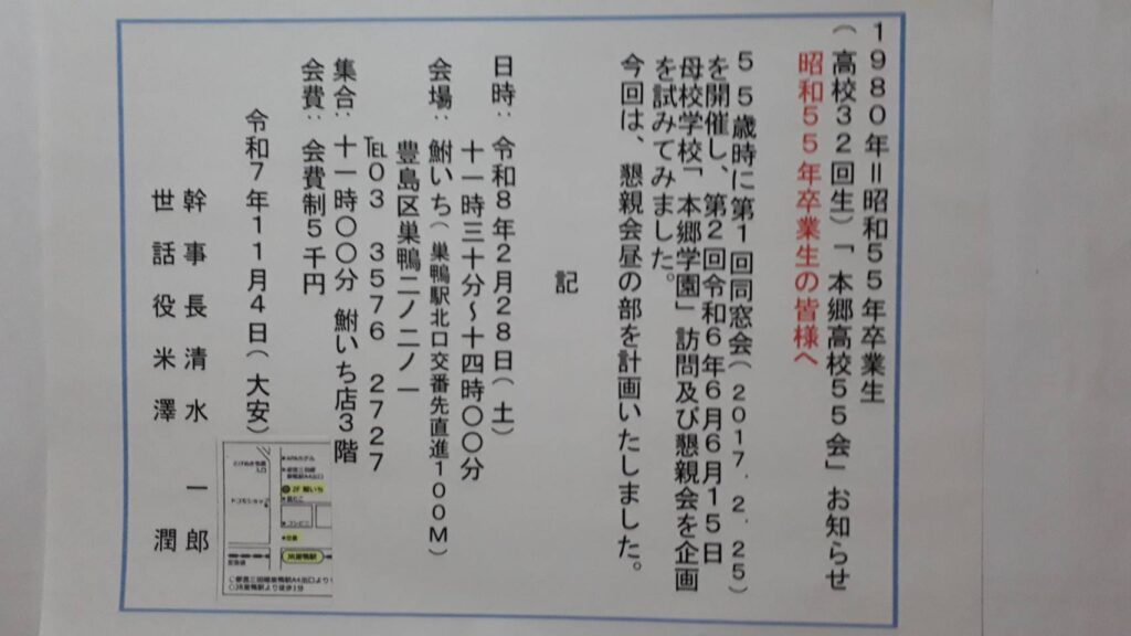 2026/02/28(土)11:00集合 ※高校第32回生(1980(昭和55)年3月卒)対象「本郷高校55会」懇親会・昼の部(幹事長:清水一郎、世話役:米澤潤)11:30~14:00、巣鴨駅北口・鮒いち